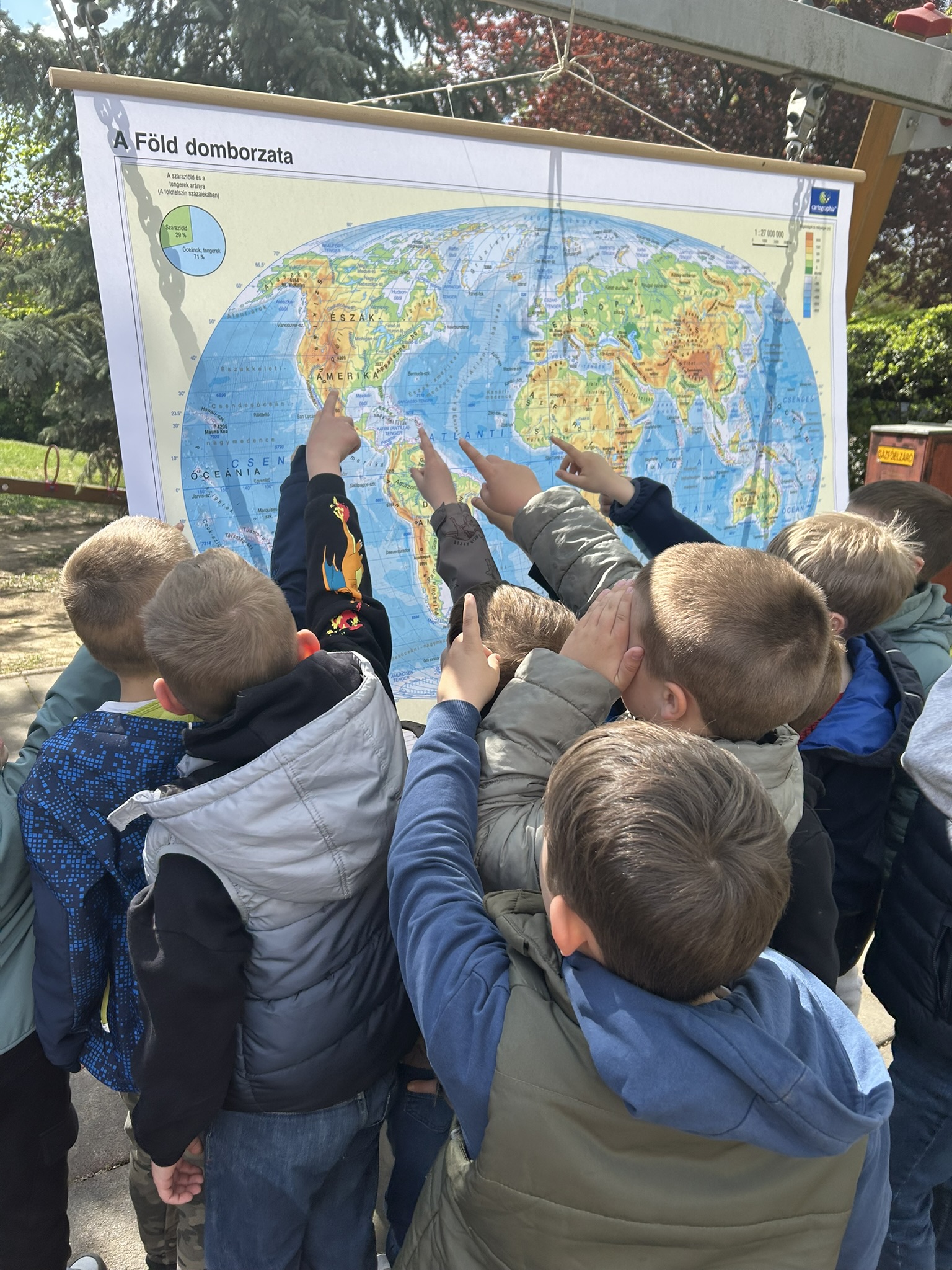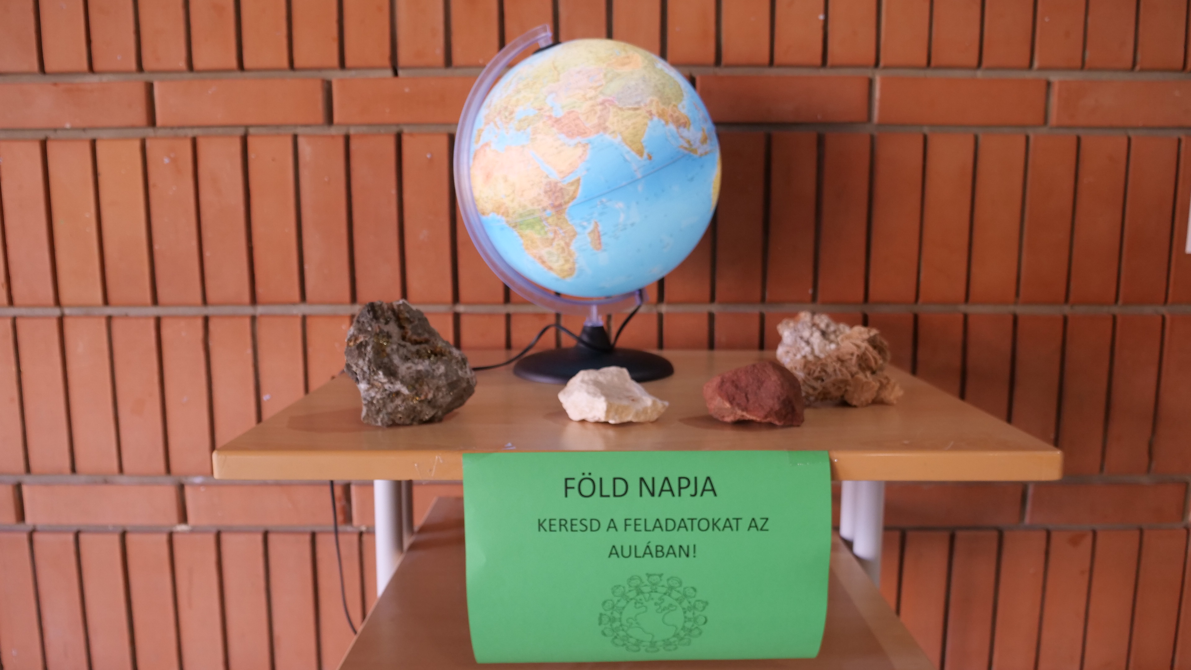 45 percben a Föld körül mottóval került megrendezésre az általános iskola Föld napi programja. Iskolánk belső terébe bevittük a természetet lépcsőmatricákkal. Az épület kerítése mentén belülről, 8 állomáson keresztül izgalmas feladatokat oldottak meg a tanulók. Az állomások neve egy-egy földrész volt. Feladatok: az országzászlók, nevek egyeztetése a kerítésre helyezett zászlóval; Földet ábrázoló lufival futás a sportpályán; műanyag állatkák